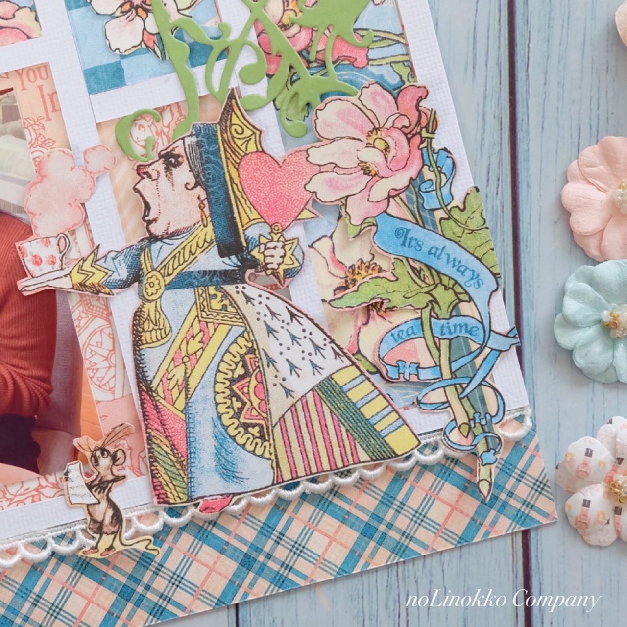 ブルーとサーモンピンクが優しく華やかで明るい雰囲気の不思議の国のアリス柄ペーパーで作る12インチサイズ(約30.5センチ正方)のスクラップブッキング作品です。
